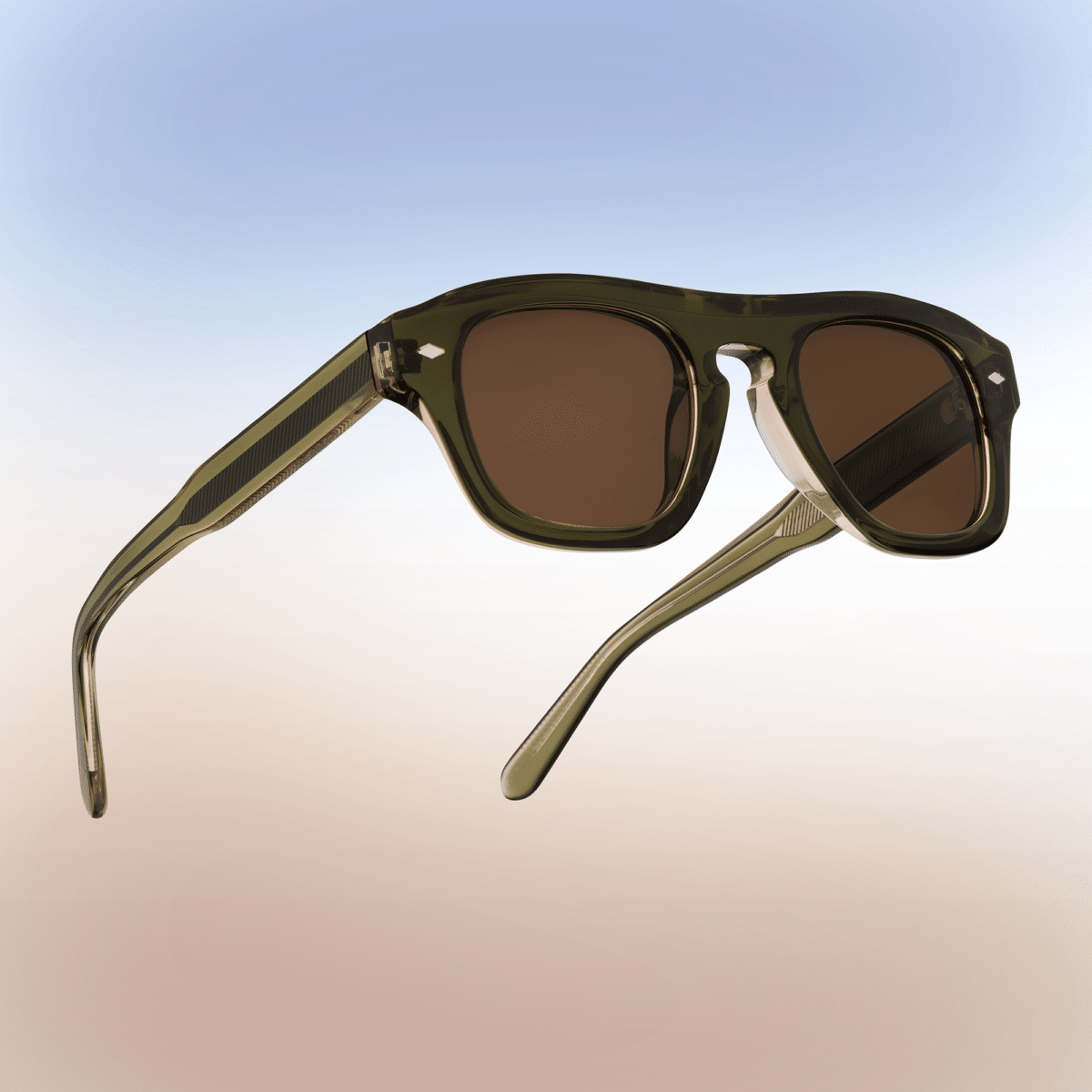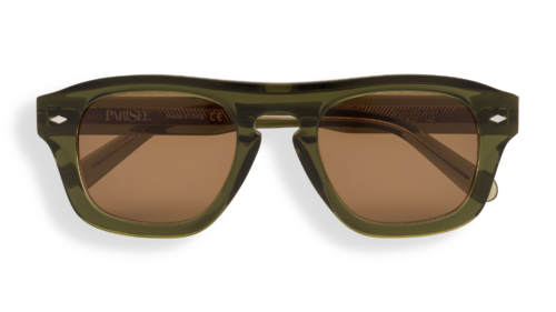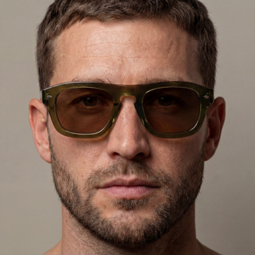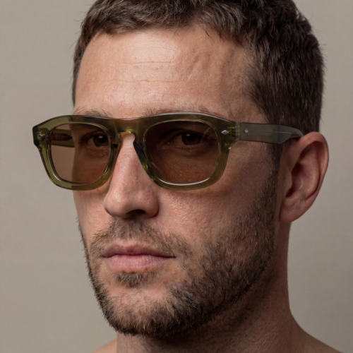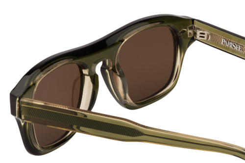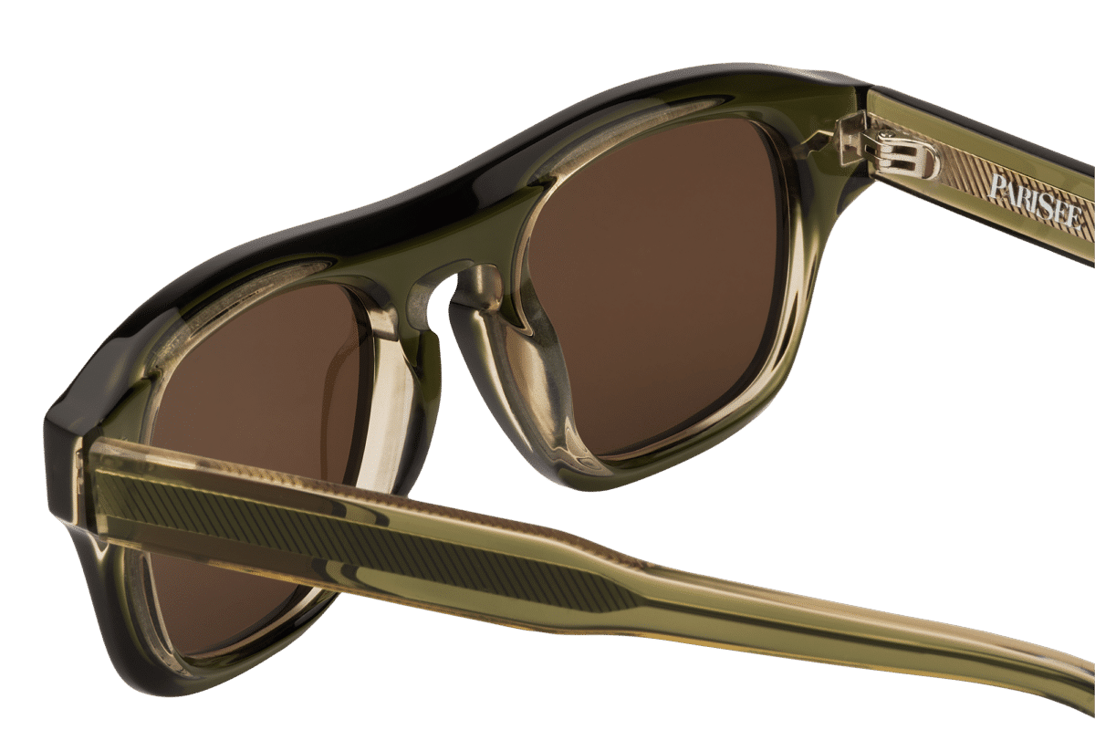 La face présente des proportions généreuses, équilibrées par un pont sculpté et des lignes continues. Les rivets visibles et les charnières intégrées participent à une construction nette et lisible. Les verres bruns en CR39 s’inscrivent avec précision dans la monture, renforçant l’harmonie chromatique de l’ensemble.