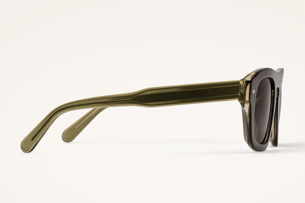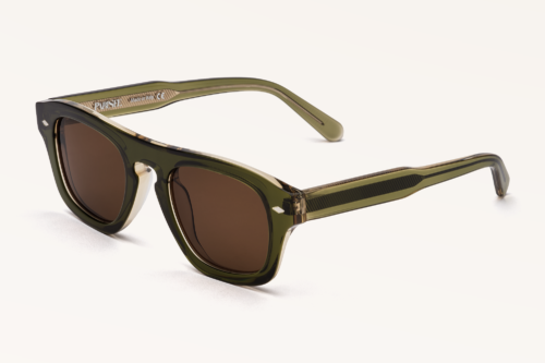 Les lunettes de soleil Lucca adoptent une silhouette rectangulaire aux angles adoucis, proposant une lecture contemporaine et structurée. La monture cerclée en acétate vert cristal brillant laisse apparaître une transparence maîtrisée, perceptible sur la face comme sur les branches, et met en valeur l’épaisseur régulière de la matière.
